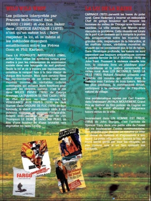 Wild Wild West - La loi de la haineRésumé : Les policiers interprétés par Frances McDormand dans FARGO (1996) et Joe Don Baker dans JUSTICE SAUVAGE (1973) n’ont qu’un même but : faire respecter la loi, et ce même si les méthodes divergent sensiblement entre les Frères Coen et Phil Karlson. | |||||