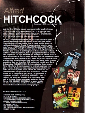 En 1925, il réalise son premier film THE PLEASURE GARDEN. Après de multiples réalisations en tous genres, il signe CHANTAGE en 1929, l’oeuvre qui annonce sa passion pour le genre policier. Après de multiples réalisation en Grande Bretagne, dont on retiendra parmi tant d’autres LES TRENTE NEUFS MARCHES (1935) et UNE FEMME DISPARAIT (1938), il s’installe aux Etats-Unis en 1940. Il y réalisera les films les plus connus de sa filmographie et deviendra une véritable institution cinématographique, dans le genre policier et dans le cinéma tout simplement. Le style Hitchcock qui privilégie de premier abord la forme au détriment du fond va laisser percevoir au fil des années une science du cinéma bien plus complexe qu’il n’y paraît. Sa fascination pour le mal et son inhibition sexuelle feront couler beaucoup d’encre, autant que ses apparitions dans ses films. Dés 1948, après avoir travaillé avec David O. Selznick sur REBECCA (1940), il devient producteur de ses propres films. Il touchera de nombreux genres cinématographiques avec plus ou moins de bonheur mais avec un talent indiscutable. Il ne triche pas avec le public en lui offrant des oeuvres de pur divertissement d’une perfection hors du commun. Dans les années 50, il s’empare du petit écran, en produisant et présentant ALFRED HITCHCOCK PRESENTE dont il réalisera de nombreux épisodes. Il ne recevra un Oscar qu’à la fin de sa vie pour son oeuvre après son dernier film en 1976 COMPLOT DE FAMILLE. Le genre policier ne peut être évoqué sans réveiller le fantôme d’Alfred Hitchcock et ses cauchemars cinématographiques.