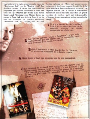 Docteur JackRésumé : Invariablement, le mythe engendre cette vision de “Gentleman Jack” ou de “Docteur Jack”. Ces dernières années, à cause des interprétations proposées par certains théoriciens et dans des films tels que Meurtre par décret, avec James Mason, Jack l'Eventreur avec Michael Caine, ou encore le From Hell avec Johnny Depp, il est de bon ton d'évoquer un complot réunissant “Gentleman Jack”, ou “Docteur Jack”, aux plus hautes sphères de l'État, qui comprennent, notamment, des francs-maçons, le petit-fils de la reine Victoria et divers ministres du royaume ! | |||||